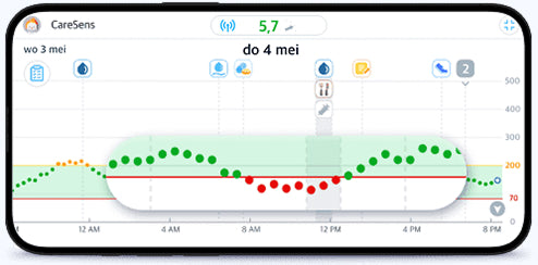 • Tik gewoon op een stip op de grafiek om de corresponderende glucosewaarde op dat specifieke moment te bekijken.