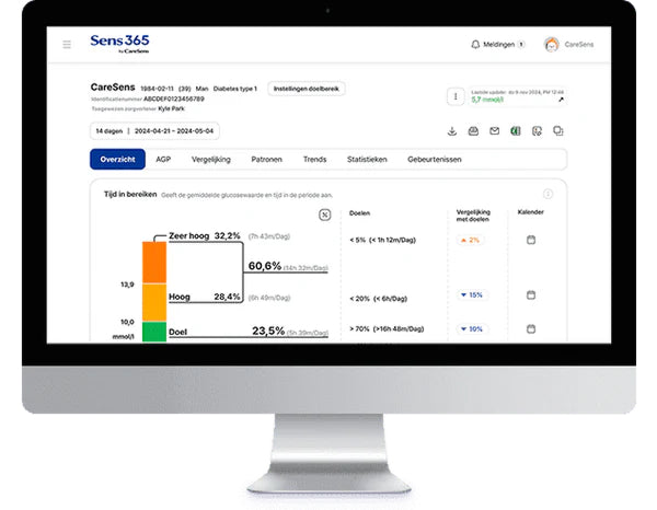 Het dashboard biedt in één oogopslag een overzicht van de belangrijkste meetgegevens voor uw glucosebeheer.