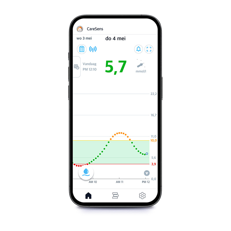 De app geeft deze metingen weer als visuele grafieken en getallen, zodat u uw glucosespiegels kunt zien en veranderingen in real time kunt volgen.